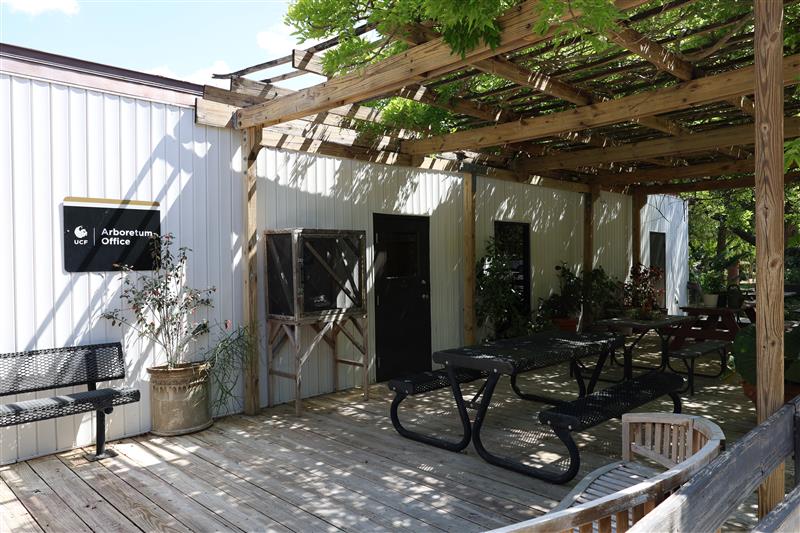Found behind the CREOL building, the entrance to the Arboretum’s main location features a lush, open area speckled with picnic benches. Fondly called Arboretum Park, this space often serves as a venue for events.